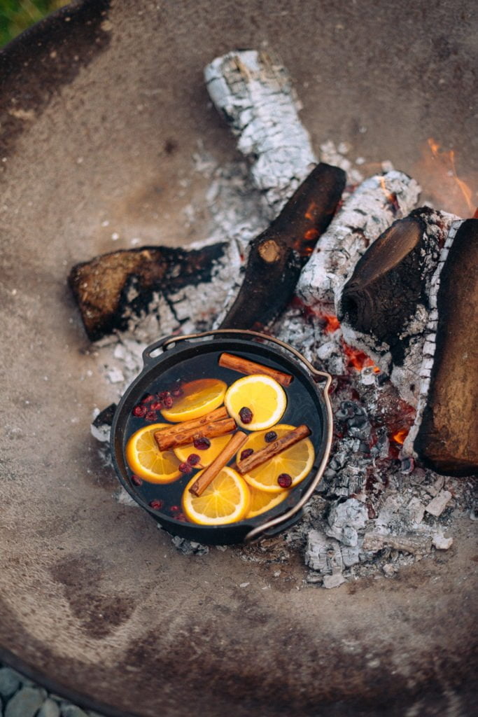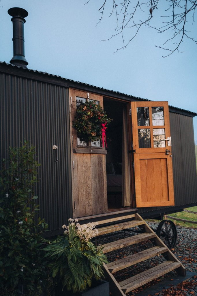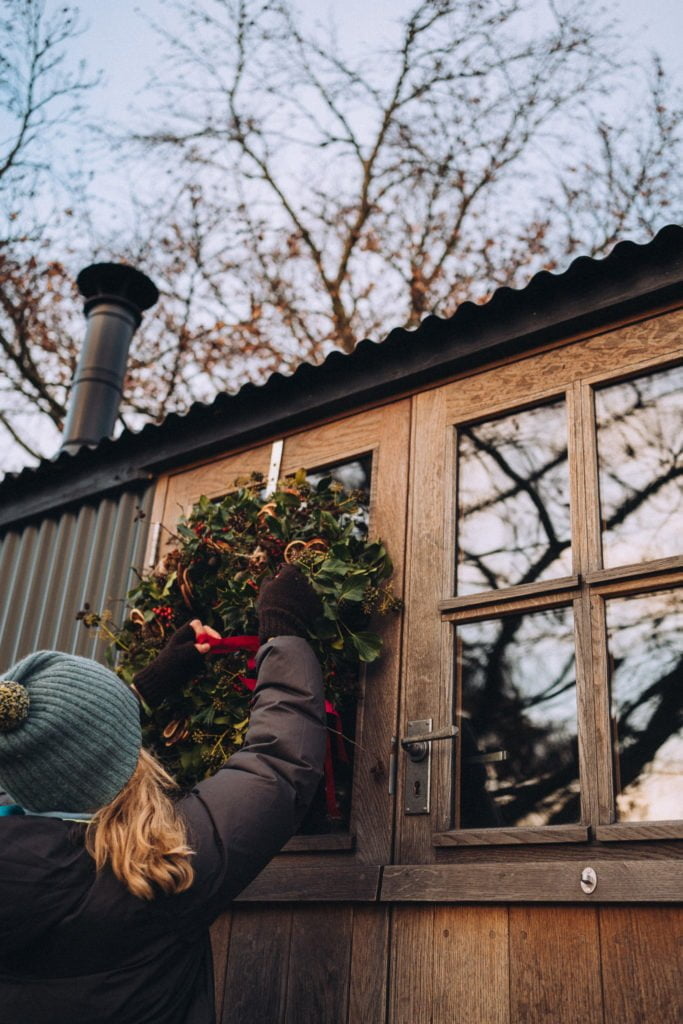A wreath of foraged foliage, pinecones, and dried oranges looks amazing hung on the shepherd’s hut door.