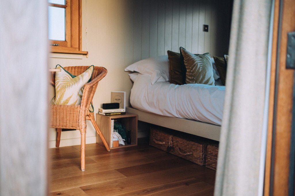 The festive theme continues inside with a garland running along the length of the shelf above the bed and a small vase of scented paper white daffodils on the table to make guests feel really welcome.