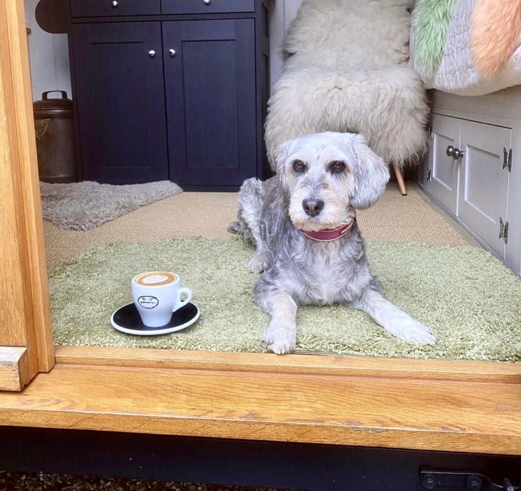 Coffee companion on the steps of the shepherd’s hut