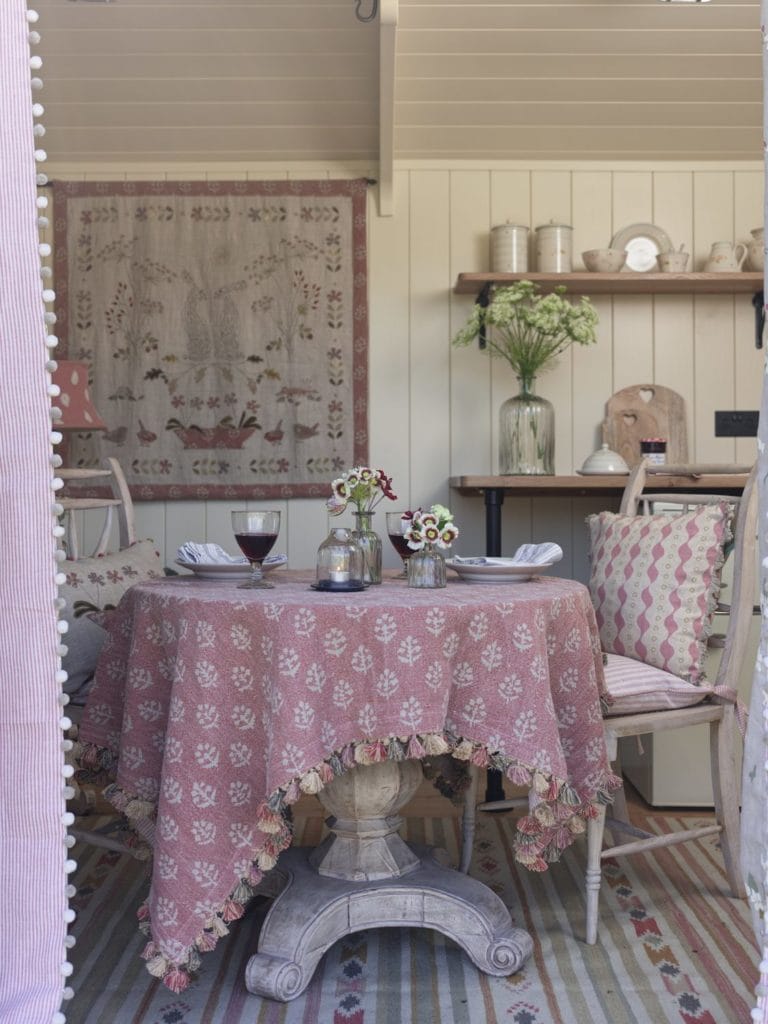 We imagined the hut sitting in a quiet meadow somewhere very pretty, so we decided on a rustic, romantic palette – warm pinks and soft stone-washed linens. A shepherd’s hut is a perfect space to play with an English pastoral colour scheme. We dressed the table with our pottery to feel a little romantic too, something that might make you want to sit with an afternoon cup of tea looking out through the double doors or sit on the steps in the early evening with a glass of wine as the sun goes down.