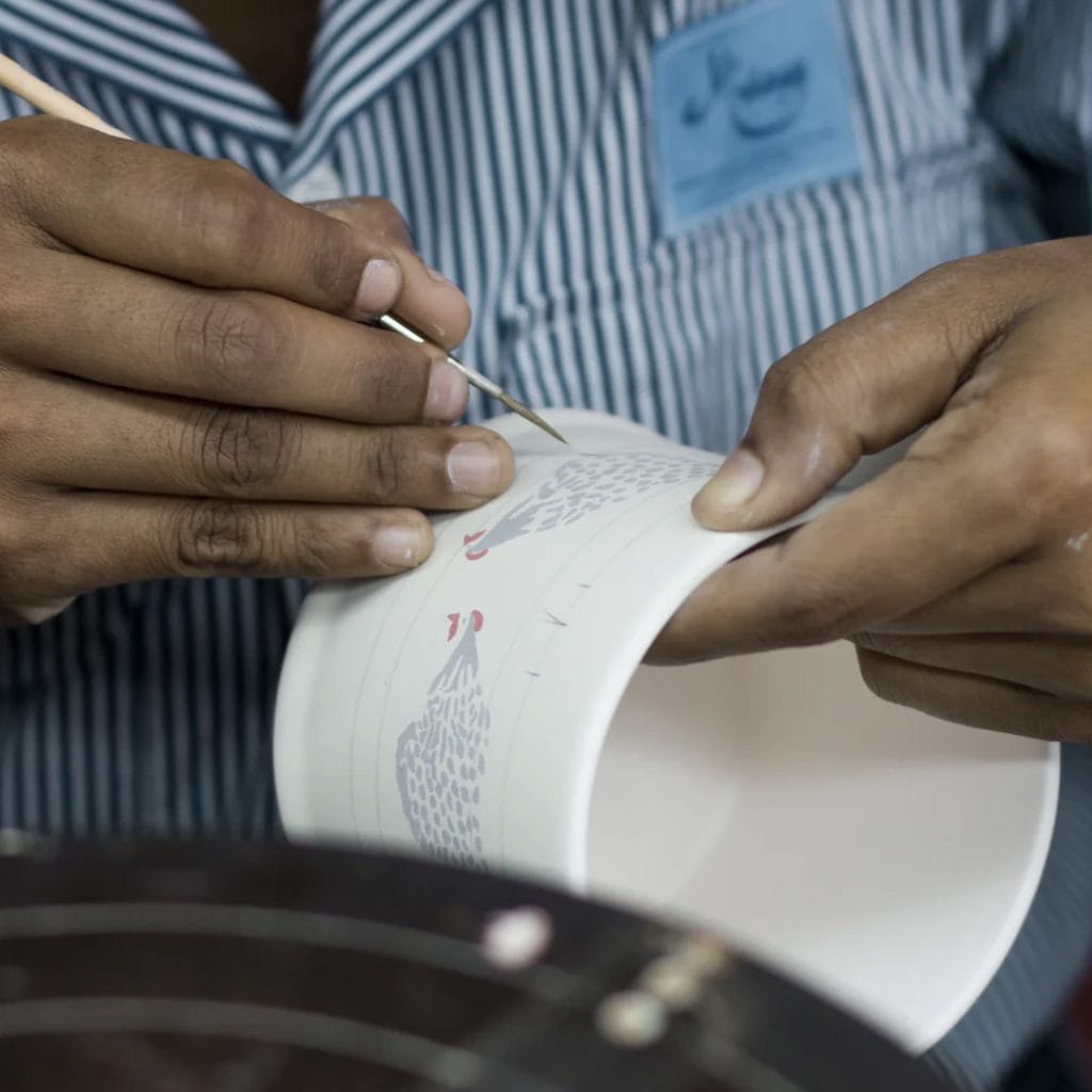 Yes, we work with a remarkable ceramics factory in Sri Lanka that has created our hand-painted pottery almost from the beginning. We also work with a textile studio in southern India, where our cushions and hand-embroidered fabrics are made, and cabinetmakers in northern India who craft our furniture. I travel out there at least three times a year and have developed a close relationship with the owners over the years. Many of our artisans sign their work where possible, which is a lovely way to create a connection between maker and customer.